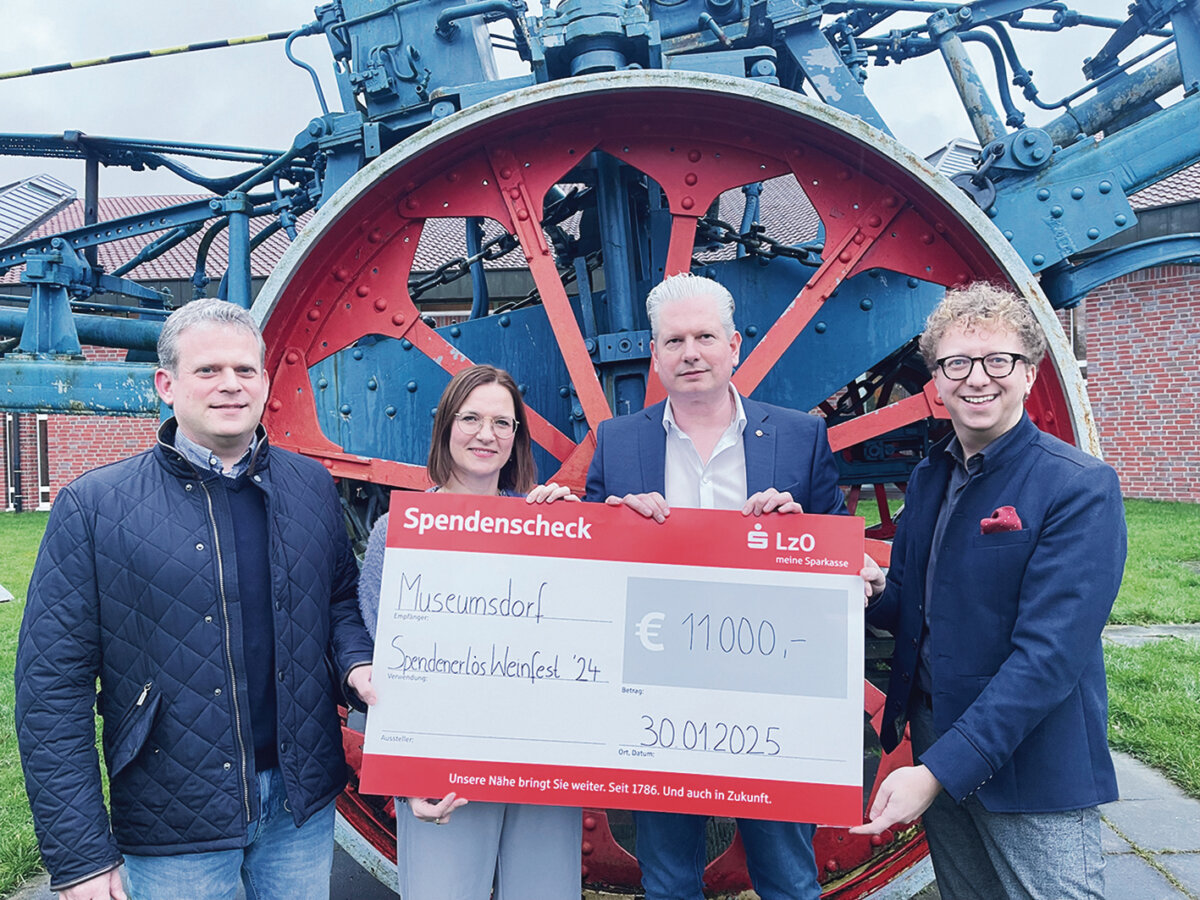 Wenn die Lions-Clubs Cloppenburgs zum Weinfest einladen, ist der Erfolg schon fast vorprogrammiert. Im Sommer 2024 kamen hunderte Besucher zum dritten Event dieser Art zum Hof Quatmann im Museumsdorf Cloppenburg. Es erbrachte den Erlös von stolzen 11.000 Euro. Mit diesem Betrag wird abermals das Museumsdorf unterstützt. „Mit dem Geld soll der Fahrzeugpark der Abteilung Grünpflege modernisiert werden“, resümiert Museumsdirektor Dr. Torsten Müller. Die drei Fördervereine der Clubs (Lions Club Cloppenburg, Lions Club Cloppenburg-Soeste und Lions Club Oldenburger-Münsterland) leisten dadurch einen wichtigen Beitrag zum Erhalt des Museumsdorfes. Nun haben die drei Vertreter der Lions-Clubs, (v.l.) Jochen Keimer, Daniela Winter und Dr. Daniel Niemüller, den symbolischen Spendenscheck an den Museumsleiter überreicht. Da sich das Weinfest fast schon zu einer Tradition entwickelt hat, freuen sich die Lions Clubs, es am 23. August zum vierten Mal im Museumsdorf Cloppenburg auszurichten.