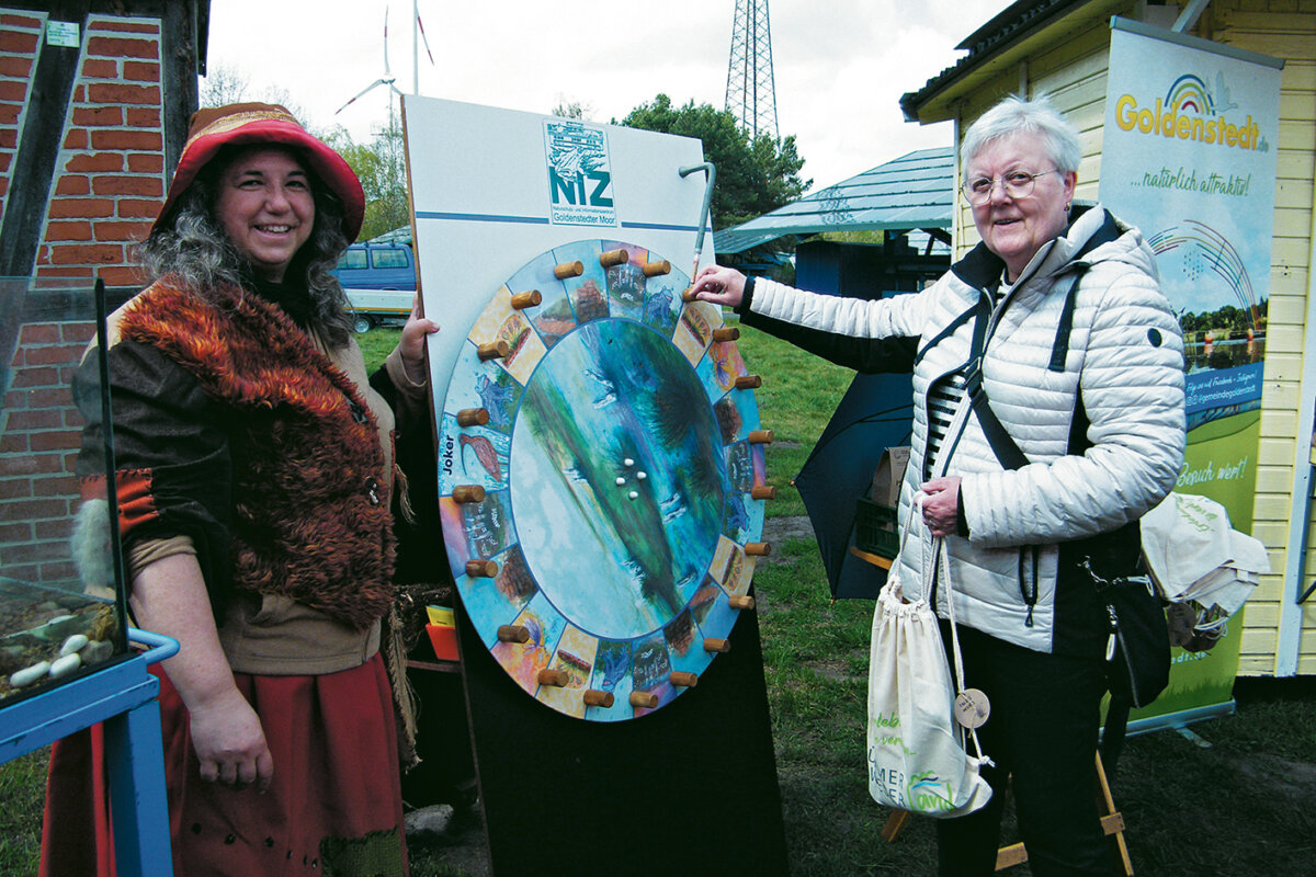 Carola Freise schlüpfte dabei wieder in das Kostüm einer Goldenstedter Moorhexe. „Ich bin jedes Jahr für unser NIZ dabei“, berichtete sie und lud überwiegend Erwachsene ein, das Glücksrad zu drehen. Dabei galt es allerdings, jeweils auch eine Frage zu Tieren oder Landschaft zu beantworten.