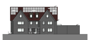 Die Ostansicht des geplanten Gemeindehauses. Baubeginn könnte Anfang 2026 sein. Grafik: preuss architektur