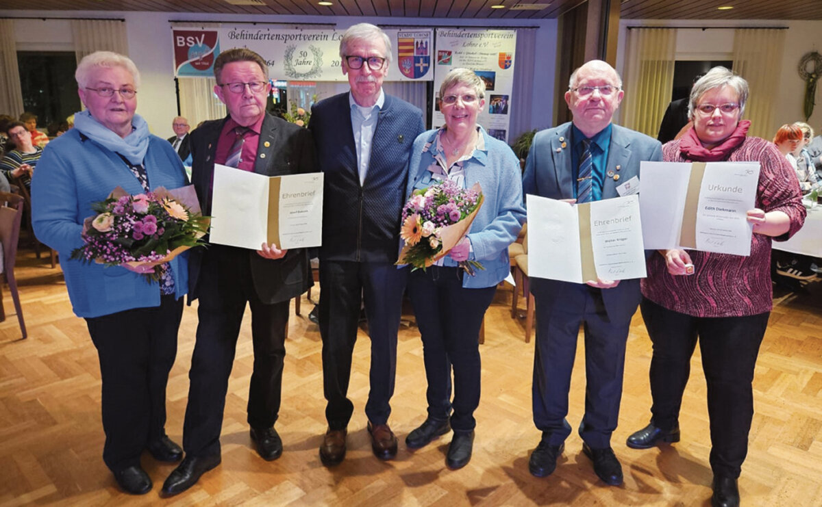 Der Behinderten Sportverband Niedersachsen (BSN) hatte es sich nicht nehmen lassen, Herbert Michels einen Vertreter zu entsenden, der die Ehrungen persönlich vornahm. Mit der hohen Auszeichnung durch den Ehrenbrief „In Würdigung hervorragender Verdienste um die Förderung des Sports mit behinderten Menschen“ wurden Josef Bokern und Walter Krüger ausgezeichnet. Edith Diekmann, die leider erkrankt war, bekam „In Würdigung der langjährigen ehrenamtlichen Tätigkeit im Sport mit behinderten Menschen“ vom BSN die Ehrennadel in Gold. Auch konnte der BSV langjährige Mitglieder auszeichnen: Für 50-jährige Mitgliedschaft wurden Walter Bokern, Ludger Goldberg und Maria Albers geehrt. Seit 30 Jahren gehören Gisela Meinerding und Monika Eik dem Verein an und Valeri Schewtschenko wurde für seine 25-jährige Mitgliedschaft geehrt. 24 Sportler durfte ein Sportabzeichen in Empfang nehmen.
