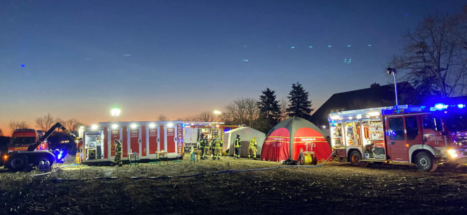 Als herausfordernd gestalteten sich die Löscharbeiten, weil sich in unmittelbarer Nähe ein Wohnhaus, eine strohgefüllte Scheune und mehrere mit Tieren belegte Geflügelställe befanden. Die Rettungskräfte konzentrierten sich zunächst darauf, eine Ausbreitung des Brandes zu verhindern. Komplizierter machten die Löscharbeiten die verwinkelte Struktur der Halle und die zum Teil schwere Zugänglichkeit. Erst gegen 5.30 Uhr konnte das Feuer unter Kontrolle gebracht werden und um 6.45 Uhr meldeten die Einsatzkräfte „Feuer aus“.