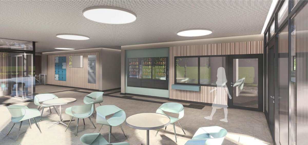 Zur Ausstattung gehören zudem eine Wärmebank, barrierefreie Zugänge, taktile Leitsysteme und insgesamt 20 neue Stellplätze, von denen drei barrierefrei sind. Der Innenraum ist inspiriert vom Südlohner Moor und setzt auf natürliche Farbnuancen und langlebige Materialien. Das Dach wird zudem mit einer Photovoltaikanlage und einer Begrünung ausgestattet, die Gebäudetechnik ist auf höchste Energieeffizienz ausgelegt.