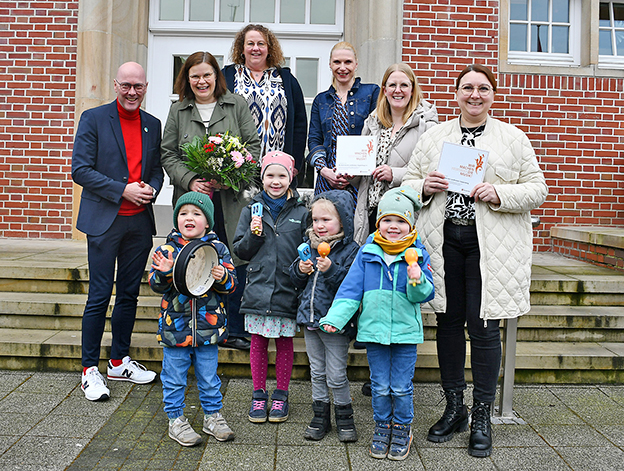 Ein fröhliches Dankeschön mit musikalischer Note: Einige Kinder und Erzieherinnen der städtischen Kitas „Löwenzahn“ und „Weltentdecker“ sowie des Waldkindergartens“ waren jetzt im Rathaus zu Gast. Mit ihrem Besuch wollten sie Bürgermeister Neidhard Varnhorn und Stadträtin Stefanie Lübbers für die Unterstützung des Projekts „Wir machen die Musik“ danken.