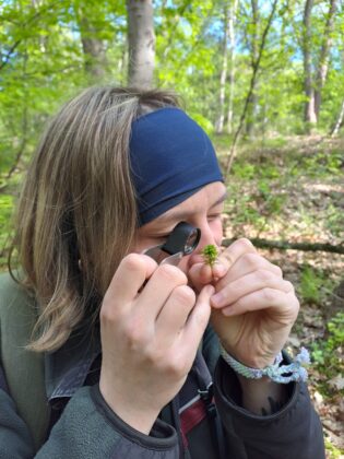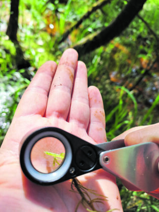Das Untersuchungsgebiet wurde in ein Quadratraster eingeteilt, jedes Quadrat sorgfältig kartiert und die Daten digital erfasst. Zu den gefundenen Arten zählen mehrere Torfmoose, Walzensegge, Schlangenwurz und Sumpfdotterblume – allesamt geschützte oder gefährdete Arten, die für einen typischen Erlenbruchwald stehen. Wichtige Hilfsmittel bei der Bestimmung: die Taschenlupen und passende Bestimmungsbücher.
