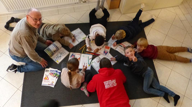 Wenn die Freunde Medina (8), Nick (6), Yasin (7), Arne (7), Johann (6) und Valentin (6) zusammenkommen ist immer was los. Meistens Spielen sie im Garten oder auf der Straße. Doch nicht immer spielt das Wetter mit und als wieder mal ein heftiger Regenschauer niederprasselt, kommt Nick das Verkehrsmalbuch der Kreisverkehrswacht Cloppenburg in den Sinn, dass die Erstklässler in der Schule bekommen hatten. Opa Achim hat „zufällig“ noch ein paar Exemplare im Auto und schon kann das wilde Ausmalen losgehen. Innerhalb von Minuten bekommt jedes Detail Farbe.