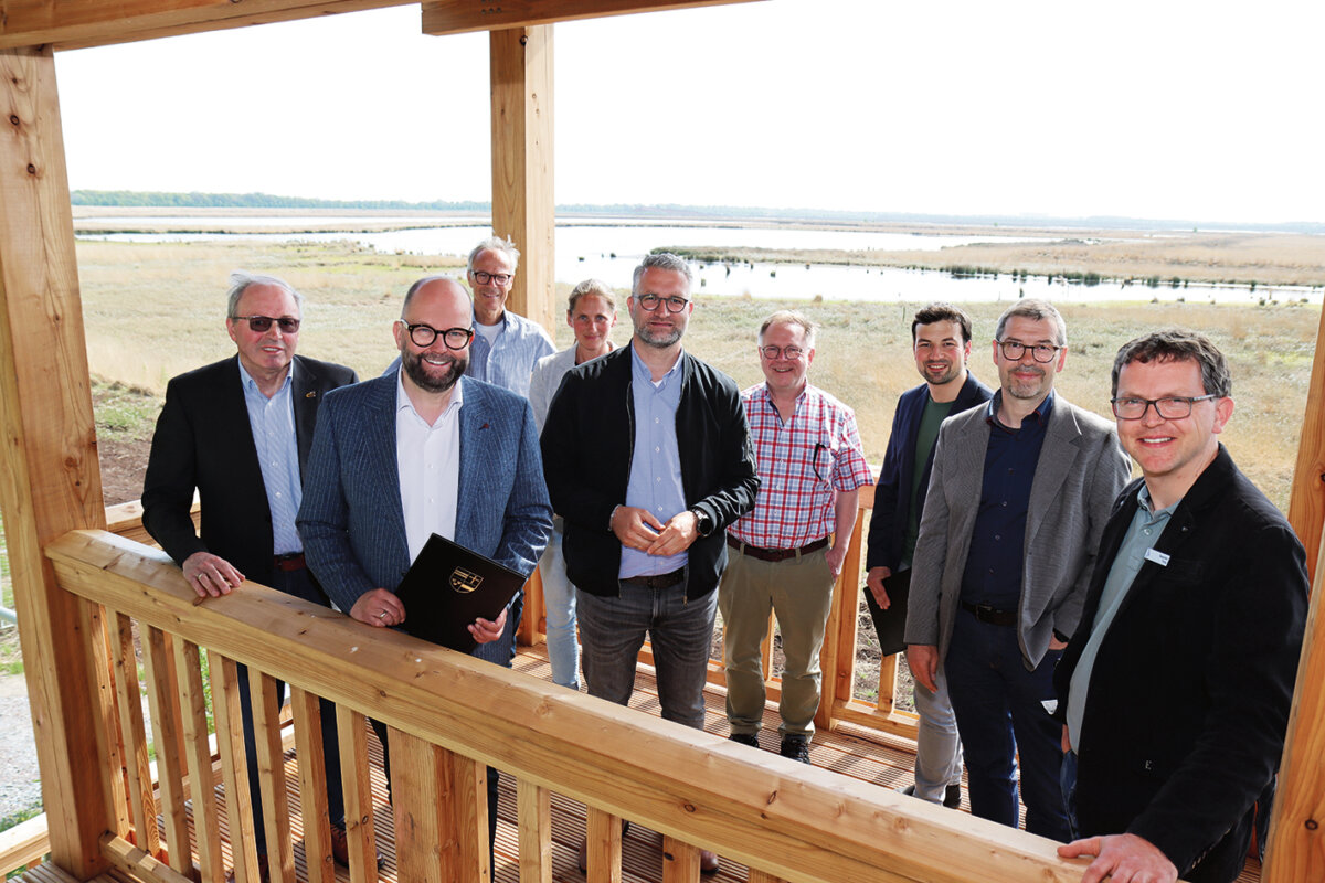 Freude über den neuen Beobachtungsturm am Vehnemoor: Bei der Einweihung dabei waren unter anderem Landrat Johann Wimberg (2. v.l.), Umweltamtsleiter Alexander Thole (rechts), sowie die Vertreter der Gemeinde Bösel stv. Bürgermeister Ludger Beeken, der allgemeine Vertreter des Bürgermeisters Rainer Hollje (2.v.r.) und Matthias Elsner von der IG Vehnemoor (4. v.r.). Foto: Sascha Rühl / LK Cloppenburg