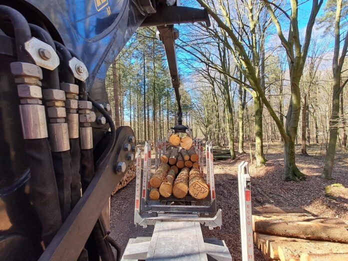 Neben Eichen und Douglasien liegen auch Buchen, Küstentannen, Lärchen und Fichten am Wegesrand. Sven Lehmkuhl, Vertriebs- und Logistikleiter beim Sägewerk Koddenbrock in Goldenstedt, hat einen Teil des Holzes gekauft: „Wir stellen Schnittholz aus Laub- und Nadelholz her, welches vor allem zu Paletten und Verpackungen verarbeitet wird. In der Försterei Harpstedt haben wir jetzt Fichte, Lärche, Küstentanne und Douglasie gekauft. Dieses Holz ist für Paletten im Baubereich gedacht, um beispielsweise Ziegel, Klinker oder Rigipsplatten zu transportieren. “