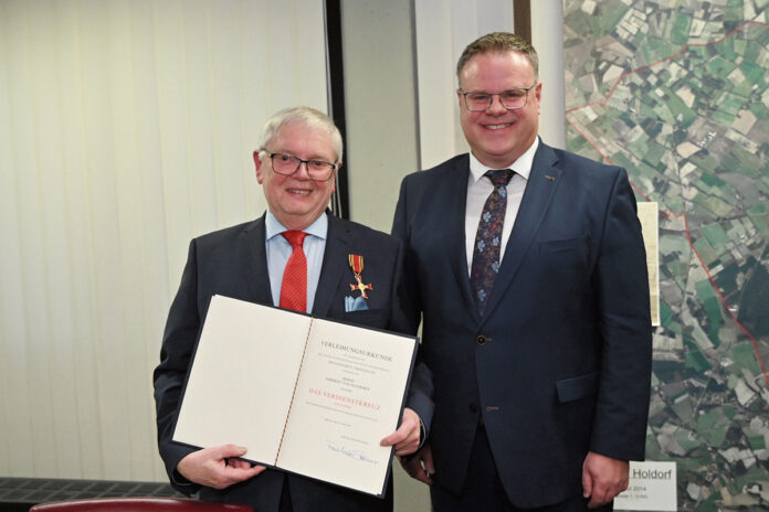 Holdorf. Sein ehrenamtliches Leben wurde Norbert von Handorff während der Feierstunde zur Verleihung des Verdienstordens der Bundesrepublik Deutschland noch einmal vor Augen geführt. Für sein mehr als 30-jähriges Engagement in der örtlichen Gemeindepolitik und im Sportverein überreichte Landrat Tobias Gerdesmeyer im Auftrage des Bundespräsidenten Frank-Walter Steinmeier dem 73-Jährigen das Bundes-Verdienstkreuz am Bande und die vom Bundespräsidenten unterschriebene Verleihungsurkunde.